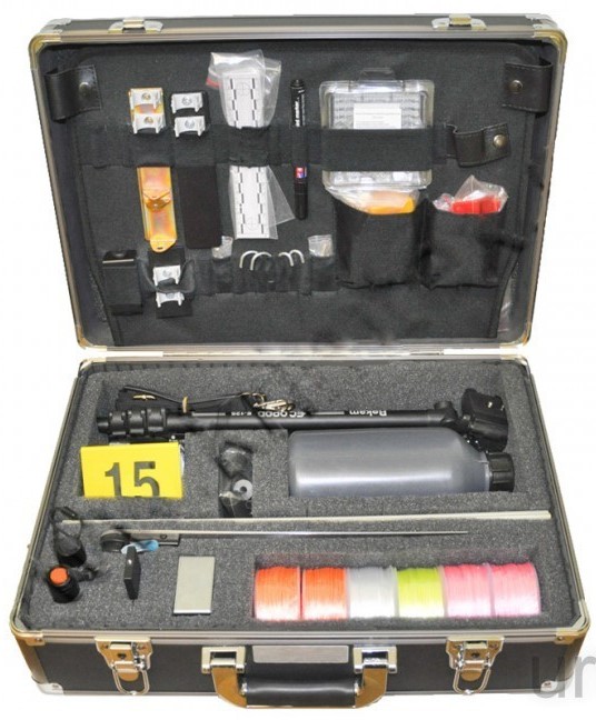 Набор состоит из специальных приборов, приспособлений, инструментов и предназначен для определения направления выстрела, траектории полета пули и определения места производства выстрела (местоположения стрелявшего) на месте преступления посредством метода проекции источника когерентного излучения.