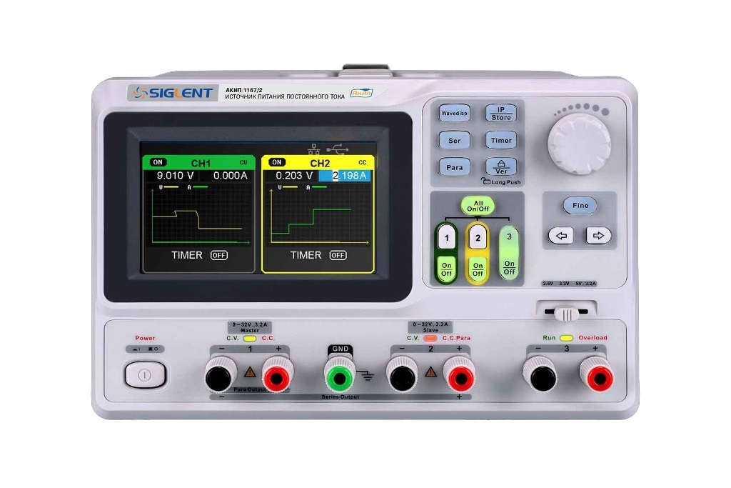 АКИП-1167/2 | 0…32 В 0…3,2 А | 0…32 В 0…3,2 А | 2,5 В/ 3,3 В/ 5 В 3,2 A | 0…64 В 0…3,2 А | 0…32 В 0…6,4 А | 204,8 Вт |
