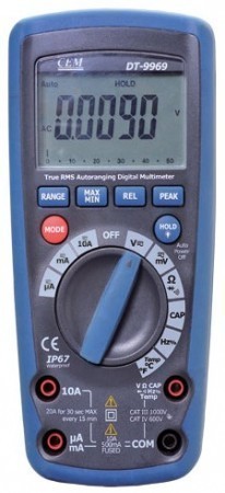 DT-9969 – профессиональный цифровой мультиметр в двойном пластиковом водонепроницаемом корпусе со степенью защиты IP67. Мультиметр измеряет среднеквадратичное значение переменного напряжения и тока – True RMS.