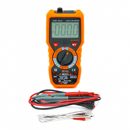 Мультиметр VERDO MH6104 – это ручной цифровой мультиметр с функцией отображения истинного среднеквадратичного значения (TrueRMS) и большим жидкокристаллическим дисплеем с подсветкой, и фонарем, что облегчает считывание показаний. Мультиметр оснащен функцией защиты от перегрузки и индикатором разряженной батареи. Этот мно-гофункциональный измерительный прибор идеально подходит как для профессионального использования на производстве, ремонта и сервисного обслуживания, так и для обучения и бытового применения.