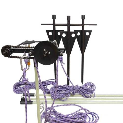 Устройство УКО-3 обеспечивает дополнительное крепление опоры тремя оттяжками из полиамидного троса с помощью трех вбиваемых в землю якорей и фиксирующего устройства, которое поднимается на опору сборной штангой и фиксируется на ней винтовым зажимом.
