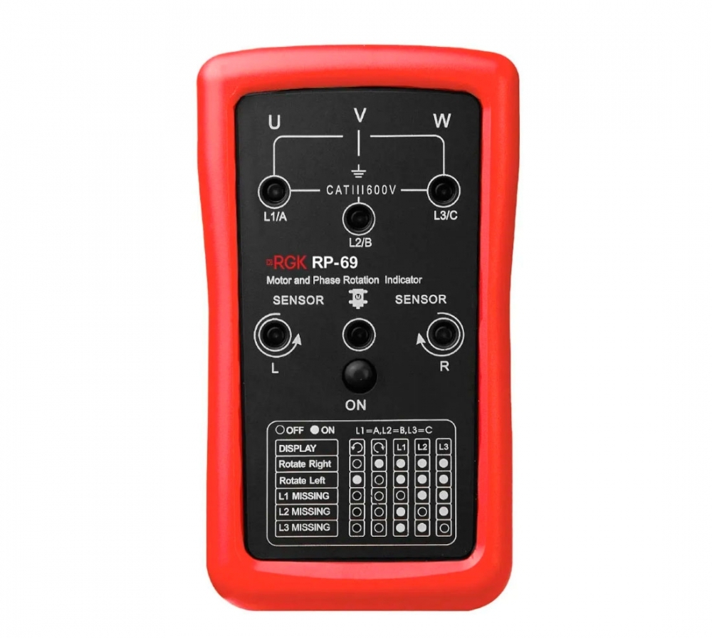 Фазоуказатель RGK RP-69 позволяет быстро провести диагностику трехфазной электросистемы или оборудования, например, электродвигателя. Специалисту доступны следующие функции: