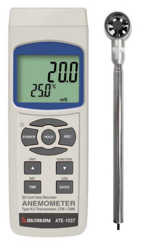 Портативный анемометр АТЕ-1037 является удобным инструментом для измерения параметров воздушного потока как на вентиляционных решетках, так и непосредственно в воздуховодах, благодаря применению в виде датчика миникрыльчатки малого диаметра с телескопической рукояткой. Помимо измерения скорости и температуры потока воздуха, прибор вычисляет объем проходящего через крыльчатку воздуха, а также измеряет температуру при помощи подключаемых термопар K и J типа. Анемометр АТЕ-1037 может подключаться к компьютеру, а, кроме того, имеется возможность сохранения измеренных данных на карту SD в формате Excel в режиме реального времени без использования специального программного обеспечения.