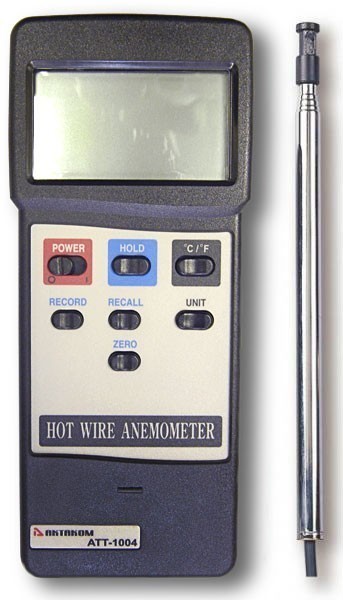 Современная модель термоанемометра с возможностью температурных измерений, работающая по принципу охлаждения воздушным потоком нагретой нити. Датчик — миниатюрный стеклянный термистор — размещается в малогабаритной измерительной головке диаметром 12 мм на телескопической ручке. Обеспечивает быстрые и точные измерения даже при низком значении скорости движения воздушного потока. Прибор отображает измеренные значения во всех принятых единицах измерения (м/с, км/ч, футы/мин, узлы, мили/час). Последнее, максимальное и минимальное измеренные значения могут сохраняться в памяти автоматически.