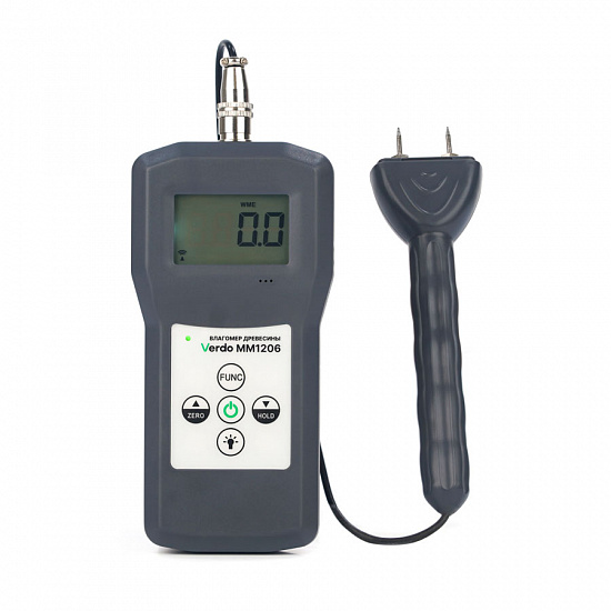 Влагомер древесины VERDO MM1206 предназначен для измерения относительной влажности различных видов древесины (8 кодов, более 100 пород). В приборе реализован кондуктометрический метод измерения с автоматической температурной компенсацией. Также во влагомере предусмотрены функции калибровки (установки) нуля и корректировки показаний. Влагомер VERDO MM1206 имеет эргономичный корпус и оснащен большим ЖК-дисплеем с посдветкой для удобного считывания показаний, а также выносным щупом для удобства измерений. Питание влагомера осуществляется при помощи четырех батарей типа ААА.